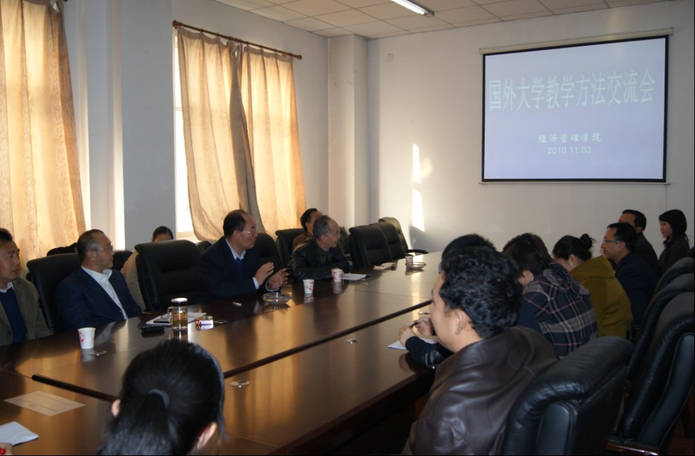 召开国外高校教学方法交流会。2010年11月3日下午,结合我校教风建设工作安排和本教学团队建设的需要,经济管理学院举行了“国外高校教学方法交流会”。参加会议的有经济管理学院相关负责人和全体教师,团队主持人、校长梁亚民教授及部分校内专业应邀参加了本次会议。经济管理学院5名海外留学归国人员分别就法国、英国、俄罗斯及日本的教育环境、人才培养模式、教学体制和教学方法进行了交流,并探讨了国外教学方法对我校教学的借鉴之处。经管学院院长林军教授对会议研讨的内容进行了点评和总结。最后,梁校长结合本次会议内容做了重要讲话。他指出:第一,学院今后要多开展教研室活动,从小处着手来不断完善人才培养模式和方案;第二,强调教师应该树立职业自豪感,加强责任心和使命感,爱岗敬业;第三,要以平等的理念对待学生,关爱学生才能搞好教学;第四,在科研工作上,教师应该具有团队意识、问题意识、方向意识和终生学习意识,不断完善知识结构,紧跟社会的发展,保障教学科研水平的稳步提高。